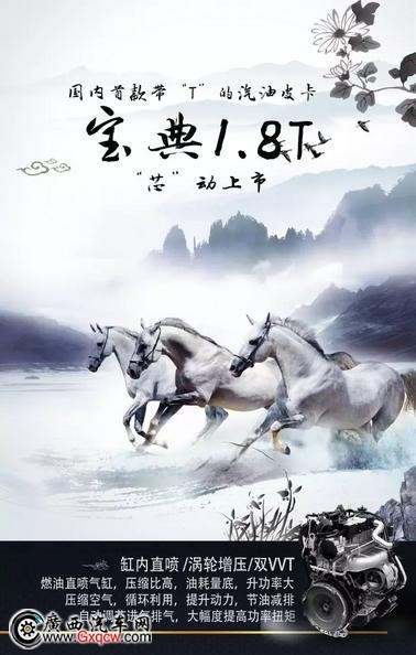 而在核心技術(shù)方面,新款寶典所搭載的1.8T汽油發(fā)動機,擁有缸內(nèi)直噴、渦輪增壓、雙VVT等多項**的發(fā)動機技術(shù),這些技術(shù)也是首次應(yīng)用于國內(nèi)的皮卡車型 。寶典1.8T*大功率130Kw、*大扭矩280N·m,百公里綜合油耗僅有8.0L!