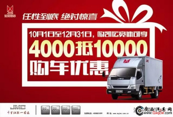 據(jù)獲悉,即日起至12月31日廣西江鈴輕卡指定車系購(gòu)車立享年度超值優(yōu)惠,即交4000元購(gòu)車訂金抵10000元購(gòu)車款,您還在猶豫什么?快快來(lái)店選購(gòu)吧!詳情咨詢熱線:0771-3119811.