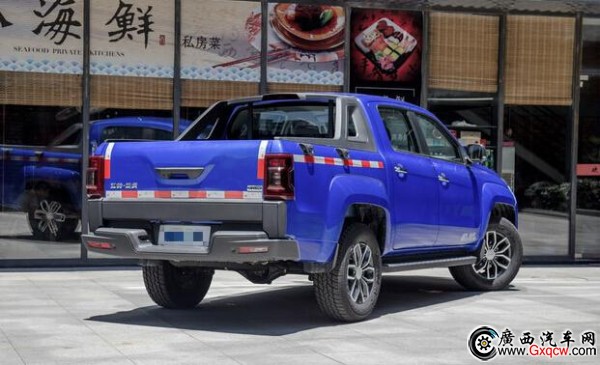 前臉采用了與猛禽相似的大尺寸進(jìn)氣格柵,調(diào)高的底盤使得其有著不錯(cuò)的接近角和離去角。側(cè)面車使用雙門設(shè)計(jì),后部的貨箱也使用了熟料材質(zhì)包裹?上У氖牵彏槠渑鋫淞诵〕叽绲妮嗇,略微顯得小氣。