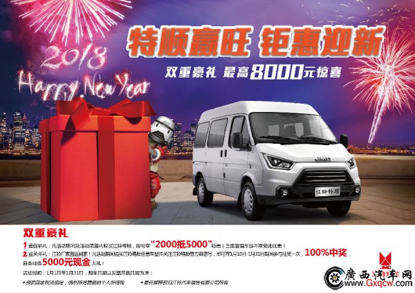 即日起到1月31日,凡活動(dòng)期間及活動(dòng)范圍內(nèi)購(gòu)買江鈴特順,就能享受“付2000抵5000”的超值購(gòu)車優(yōu)惠。ㄈご疤貎r(jià)車型不享受此優(yōu)惠)