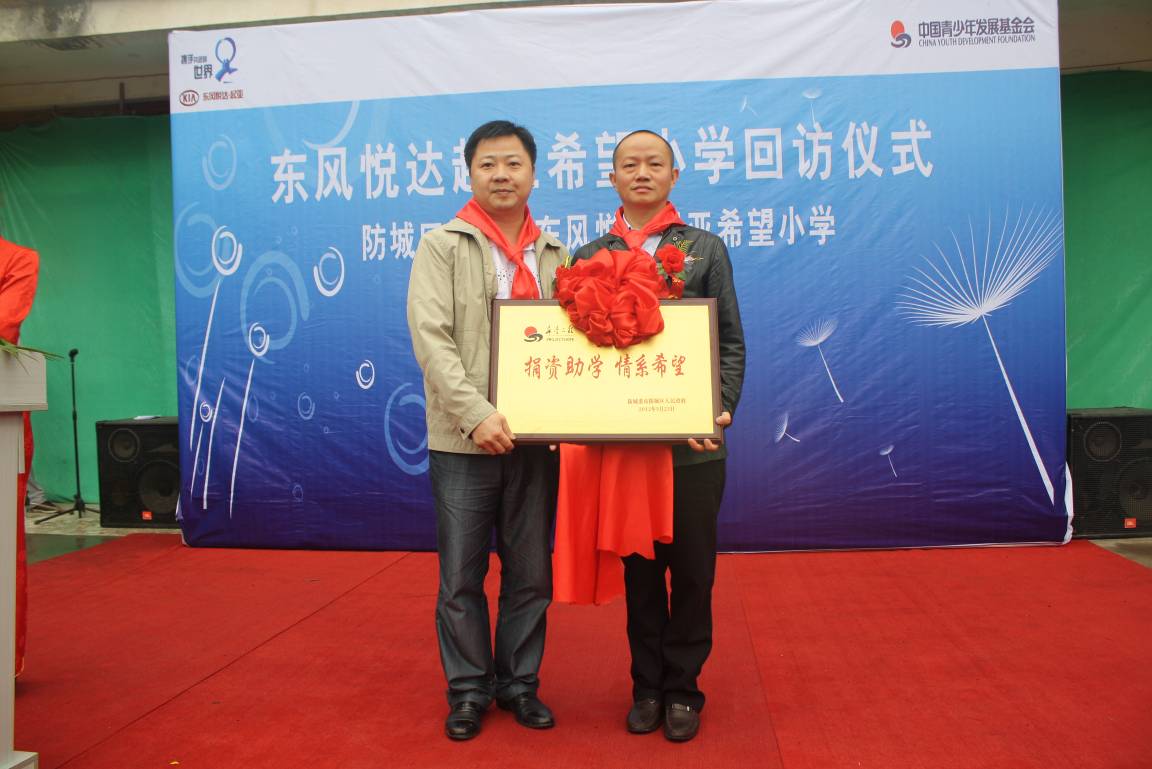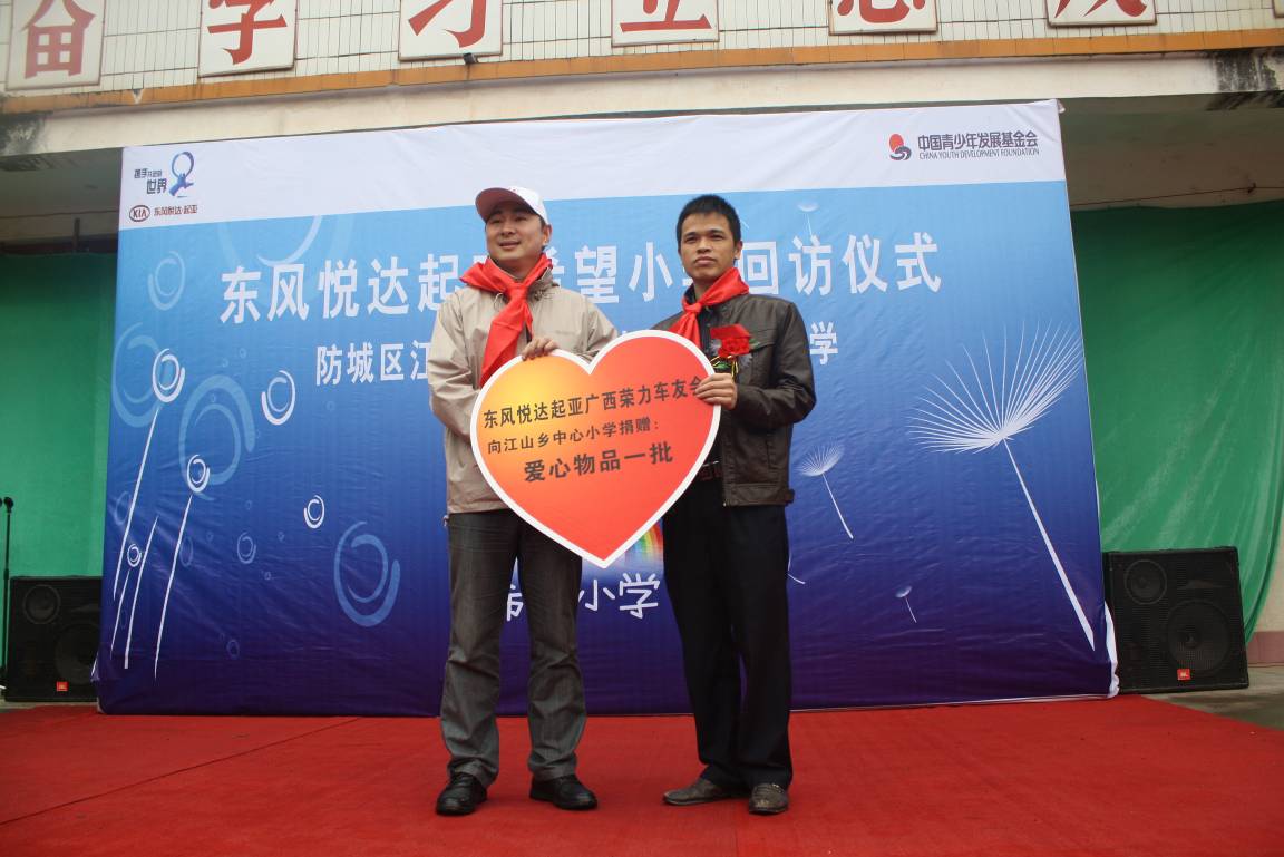 3月23日,由東風(fēng)悅達(dá)起亞汽車有限公司捐資援建的廣西省防城港市江山鄉(xiāng)中心小學(xué)東風(fēng)悅達(dá)起亞希望小學(xué)舉行了隆重的回訪儀式。防城港市領(lǐng)導(dǎo)、防城港市教育局領(lǐng)導(dǎo)、中國青少年發(fā)展基金會領(lǐng)導(dǎo)、東風(fēng)悅達(dá)起亞公關(guān)部部長 吉同順、東風(fēng)悅達(dá)起亞汽車有限公司廣州商務(wù)代表處首席代表童兵、東風(fēng)悅達(dá)起亞汽車有限公司廣州商務(wù)代表處銷售督導(dǎo) 白曉強(qiáng)、東風(fēng)悅達(dá)起亞南寧榮力4S店總經(jīng)理李銘、廣西榮力車友會的車友們以及江山鄉(xiāng)東風(fēng)悅達(dá)起亞希望小學(xué)全體師生和各大媒體共同參加了本次儀式。