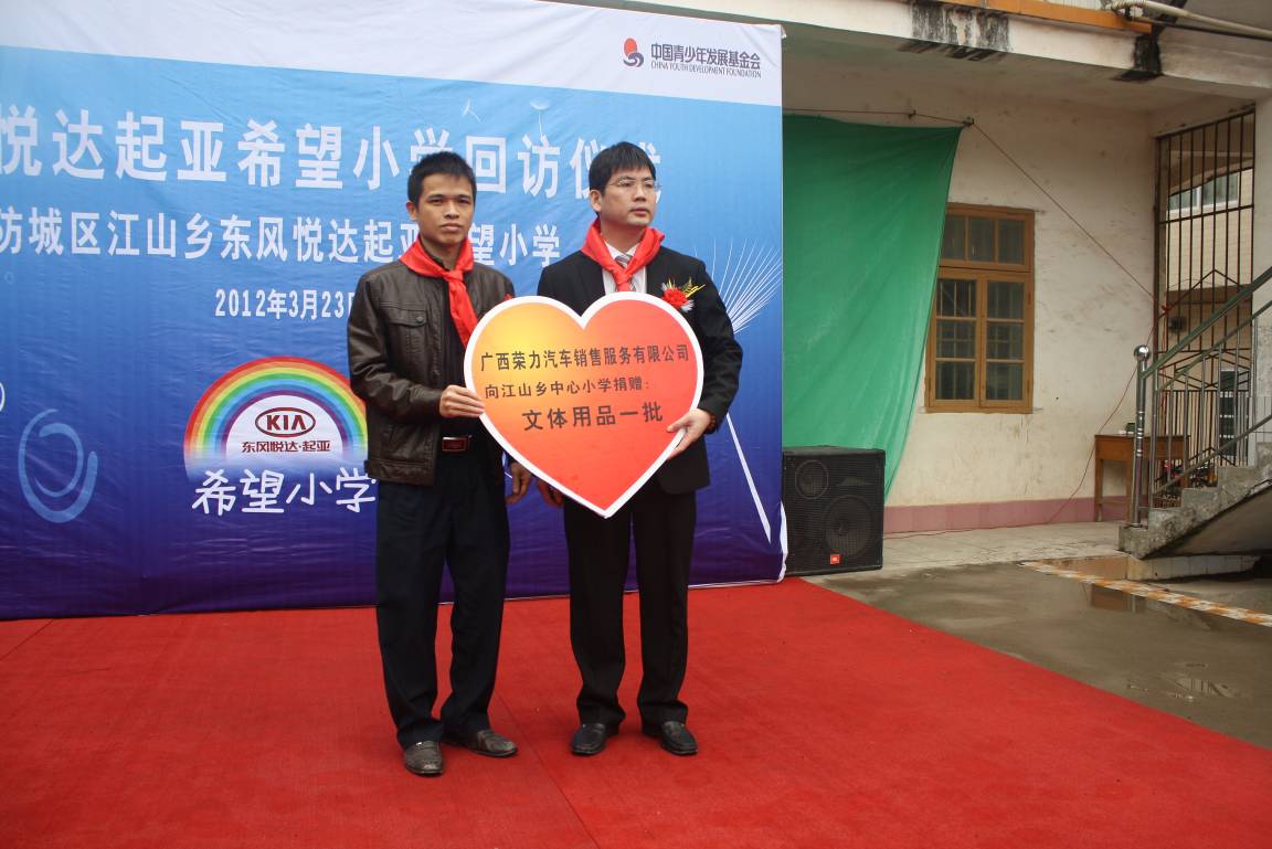 東風(fēng)悅達(dá)起亞廣西榮力4S店總經(jīng)理李銘代表榮力公司向希望小學(xué)捐贈文體用品一批。