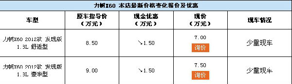 近日,開(kāi)天力帆店內(nèi)力帆X60現(xiàn)車(chē)銷(xiāo)售,顏色可選,目前購(gòu)車(chē)部分車(chē)型可優(yōu)惠1.5萬(wàn)元,感興趣的朋友可以到店咨詢(xún)購(gòu)買(mǎi),詳情見(jiàn)下表: