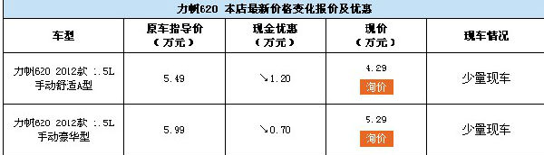 近日,開天力帆店內(nèi)力帆620現(xiàn)車銷售,顏色可選,目前購車部分車型可優(yōu)惠1.2萬元,感興趣的朋友可以到店咨詢購買,詳情見下表: