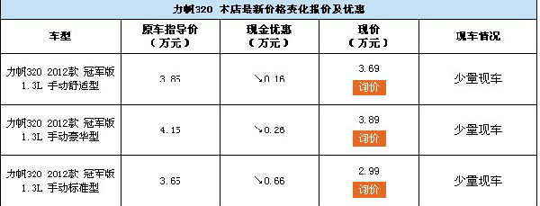 近日,開天力帆店內(nèi)力帆320現(xiàn)車銷售,顏色可選,目前購車部分車型可優(yōu)惠0.66萬元,感興趣的朋友可以到店咨詢購買,詳情見下表: