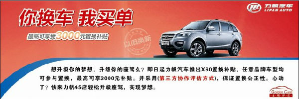 想升級您的夢想!升級您的座駕么?即日起到南寧開天力帆4S店參與力帆汽車推出的SUV車型X60以舊換新活動,*高可享受3000元補貼。任意品牌車型均可參與置換!快來南寧開天力帆4S天輕松升級您的座駕吧!詳詢15177182482