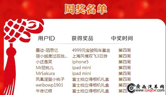 “家有喜事,我送寶駿”報(bào)喜活動就要接近尾聲了,這期公布了活動第四周獲獎(jiǎng)的網(wǎng)友名單,在這里南寧遠(yuǎn)昌寶駿4S店要恭喜獲得我們大獎(jiǎng)的網(wǎng)友們。沒有中獎(jiǎng)的朋友們不要泄氣,抓緊時(shí)間,也許幸運(yùn)女神會在*后時(shí)刻垂青于你哦。下面是我們本期中獎(jiǎng)網(wǎng)友們的名單,讓我們再次祝賀他們!