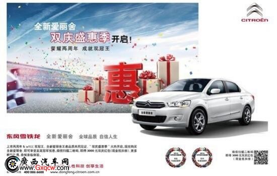 榮耀兩周年,不僅是雪鐵龍雙杰全新愛麗舍和全新世嘉產(chǎn)品力所致,更是源于消費者的信賴有加,值此雙慶盛惠季,各種禮遇不斷,各位心動不如行動。