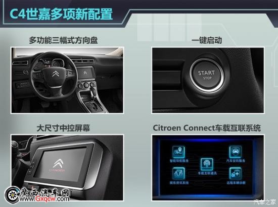 在配置方面C4世嘉再次升級(jí),車輛全系標(biāo)配了7英寸彩色智能多媒體觸屏系統(tǒng),同時(shí)還配備了一鍵啟動(dòng) 智能免鑰匙進(jìn)入系統(tǒng),以及集“智能導(dǎo)航、娛樂資訊、汽車安防服務(wù)、遠(yuǎn)程車輛診斷、車載互聯(lián)通訊”于一身的Citroen Connect車載互聯(lián)系統(tǒng)。同時(shí),東風(fēng)雪鐵龍C4世嘉還搭載了諸如一鍵啟動(dòng)、盲區(qū)監(jiān)測等主流配置。