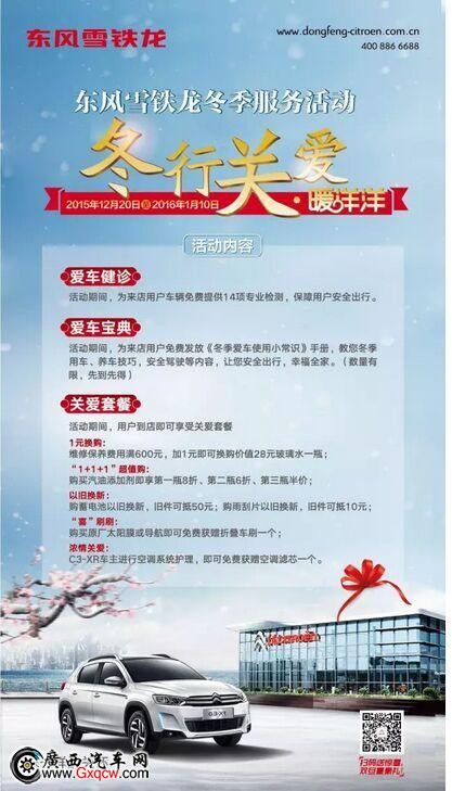 2015年12月20日至2016年1月10日,東風(fēng)雪鐵龍冬季服務(wù)活動(dòng)在全國特約服務(wù)商全面開展,為廣大用戶提供主動(dòng)、專業(yè)、溫馨的服務(wù),傳遞東風(fēng)雪鐵龍“家”一樣的關(guān)懷!