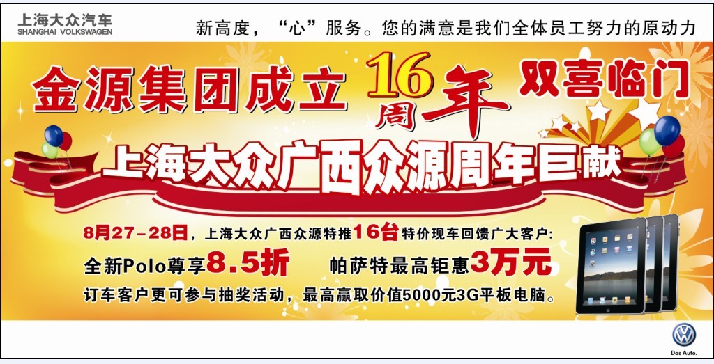 熱烈慶祝金源集團成立16周年慶暨上海大眾廣西眾源建店一周年慶,雙喜臨門。8月27—28日,上海大眾廣西眾源感恩大回饋,特別推出16臺特價現(xiàn)車回饋廣大客戶。在明亮舒適的展廳賞車還可暢享冰涼爽快的冰淇淋,不用再等待車展,現(xiàn)在就是車展價!