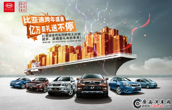 比亞迪全系車型跨年盛惠,億萬豪禮送不停,新年將近,公司決定在2015年1月31日舉辦比亞迪跨年盛惠的店頭活動。比亞迪全線車型觸底大促銷,進(jìn)店有禮、試駕有禮、訂車有禮、轉(zhuǎn)介紹有禮,歡迎廣大車迷朋友參加,目前比亞迪速銳,S7等火熱搶購中,敬請期待您的到來!