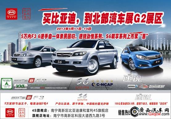2013年4月11日-14日,備受廣西車友矚目的2013年第十屆北部灣車展即將拉開帷幕,南寧高新區(qū)比亞迪康和富利4S旗艦店將攜全新的2013款6速手自一體F3及速銳勁悅系列、S6精享系列震撼上市,屆時將推出“5萬內(nèi)F3 6速手自一體親民回歸,速銳勁悅系列、S6精享系列上市聚“惠”活動。
