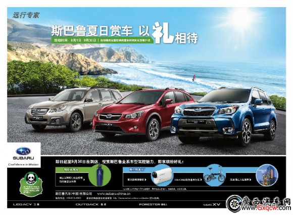 上班時侯,沒時間看車;下班時間,沒市場購車。這是大多數(shù)購車一族*大的煩惱。尤其到了炎炎夏日,面對燥熱的天氣,白天一切出行的意愿都消失殆盡。即日起至2014年9月30日,為了方便廣大顧客賞車購車,百事成斯巴魯4S店隆重推出汽車夜市,每天營業(yè)時間延長到晚上9點(21:00),讓顧客朋友們可以利用下班后的休息時間悠閑地看愛車、選愛車,竭誠為廣大消費者提供一個清涼舒爽的看車時間,到店試駕還可獲贈斯巴魯特別定制禮品;購車尊享數(shù)碼攝像機、時尚折疊自行車、豪華五星酒店入住好禮三選一!