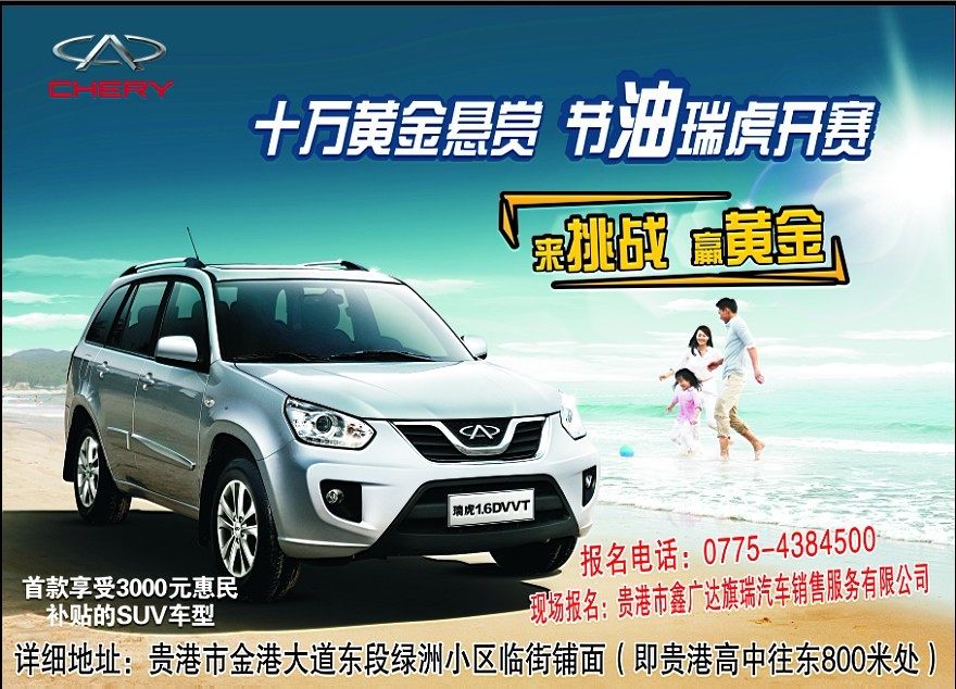 在車展期間,奇瑞汽車狂降2萬(wàn)元!車展期間參展車型均為史無(wú)前有的*優(yōu)惠價(jià)格!地點(diǎn)就在貴港市新世紀(jì)廣場(chǎng),我們相約不見不散。而且您只要憑我們?cè)谌肟谔幇l(fā)放的宣傳單頁(yè),就可以在奇瑞汽車展位免費(fèi)試喝夏日新鮮飲品!