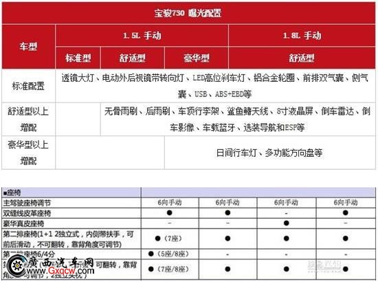 從本次獲得的車型配置看,寶駿730將推出1.5L和1.8L的4款手動擋車型,其中,最低配的標準型將提供5、7、8座三種布局形式,而其余車型均為7 座布局。標準配置上,該車提供透鏡大燈、LED高位剎車燈、前排雙氣囊、側氣囊等;舒適型以上增配無骨雨刷、后雨刷、車頂行李架、鯊魚鰭天線、8寸液晶 屏、倒車雷達、倒車影像、車載藍牙等,并可選裝車載導航和ESP系統(tǒng)等。