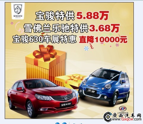 2、寶駿汽車金秋鉅惠,樂馳特供3.68萬、寶駿特供5.88萬,特惠直降10000元。