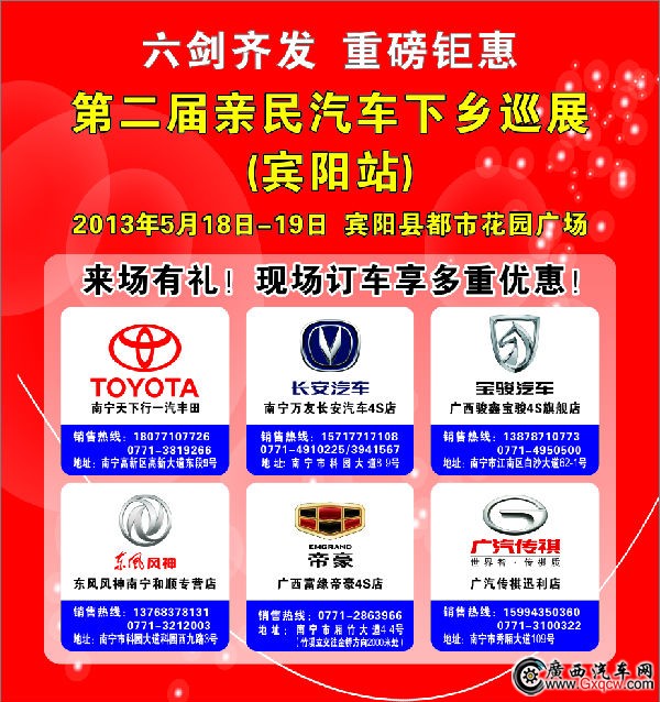 首站巡展與5月11日至12日在武鳴取得了圓滿成功,本次巡展是第二屆汽車下鄉(xiāng)巡展活動的第二站,品牌數(shù)量更多,優(yōu)惠幅度更大,寶駿汽車駿鑫旗艦店聯(lián)合一汽豐田天下行、長安萬友、東風(fēng)風(fēng)神和順、帝豪富源、廣汽傳祺迅利店、海馬?倒财邆品牌共同發(fā)力賓陽站。