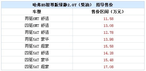 近日,長城汽車的哈弗H5智尊版綠靜2.0T柴油車上市,新動(dòng)力搭載了長城的2.0T自主發(fā)動(dòng)機(jī),匹配6擋手動(dòng)和5擋自動(dòng)兩種變速箱,有四驅(qū)和兩驅(qū)兩種,一共八款車型,售價(jià)在11.58 -17.08萬元。具體車型價(jià)格如下:廣西長道汽車為了感謝廣大八桂車友會(huì)我們的支持和厚愛,特在2012年2月15日——2月29日,針對哈弗H5智尊2.0T綠靜車型進(jìn)行年度型鉅惠,現(xiàn)金——豪華禮包,*高達(dá)到8000元,現(xiàn)車數(shù)量有限,優(yōu)惠詳情請咨詢我公司購車熱線。