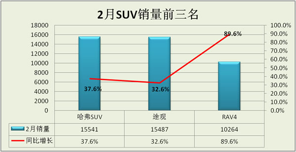 在經(jīng)歷了1月同比、環(huán)比大幅下降的考驗后,2月SUV市場找回了狀態(tài),以高于30%的速度繼續(xù)保持快速發(fā)展。與上月相比哈弗、漢蘭達、CR-V等主流車型都呈現(xiàn)快速增長,但遺憾的是月銷量過萬的僅三個品牌,哈弗、途觀、RAV4,分別以15541輛、15487輛、10264輛的銷售成績位列三甲。