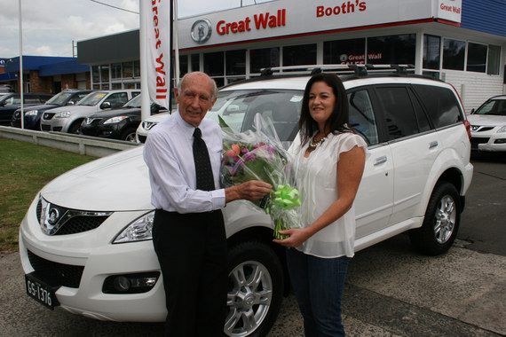 圖為蓋伊•福利自長城汽車展位凱文經(jīng)理那里,拿到了她的新車鑰匙與一束鮮花,以此來紀念在澳大利亞售出第20000長城汽車的這一刻