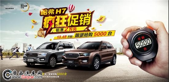 限量搶購(gòu)5000臺(tái),哈弗H7現(xiàn)金鉅惠20000元,可享12期O息、13-36期6.99%低息金融優(yōu)惠。