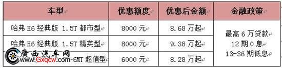 即日起,凡到廣西長道4S店購買哈弗H6經(jīng)典版1.5T精英型、都市型任意一款配置車型即可享受8000元的現(xiàn)金優(yōu)惠;凡是購買H6經(jīng)典版1.5T 6MT超值型配置車型即可享受6000元的現(xiàn)金優(yōu)惠。
