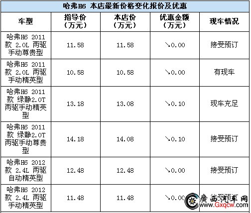 近日,廣西長道店內(nèi)哈弗H6有部分現(xiàn)車,顏色也基本齊全。喜歡哈弗H6的顧客,千萬不要錯過了,在炎炎夏日里,廣西長道的放暑“價”活動。顧客訂哈弗H6柴油版即享現(xiàn)金優(yōu)惠1000元,更有送10萬元第三者責任險和超值大禮包。喜歡該車的朋友不妨到店面談或電話咨詢。具體車型及價格參見下表: