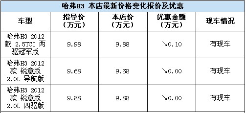 近日,廣西長道店內(nèi)哈弗H3部分現(xiàn)車銷售,接受預(yù)定,*高可享價值5000元超值大禮包。哈弗H3冠軍版,送價值3000元大禮,哈弗H3銳意導(dǎo)航版,送價值5000元精裝大禮,哈弗H3銳意四驅(qū),送價值5000元影音導(dǎo)航設(shè)備。希望廣大車友扎進時機。具體優(yōu)惠情況請參考下表。具體優(yōu)惠,以店面銷售顧問解釋為主。