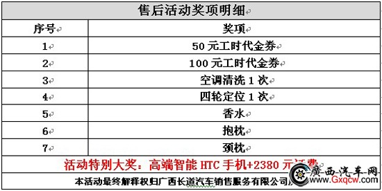 長城汽車廣西長道4S旗艦店:廣西長道汽車隸屬于全國汽車經(jīng)銷商100強集團(tuán)有道汽車集團(tuán),值此有道汽車成立十周年之際,我公司特舉行盛大感恩回饋新老車主活動!10月22日-11月30日,“有道十年齊歡聚 優(yōu)享服務(wù)中大獎”之售后服務(wù)優(yōu)惠喜抽大獎系列活動火熱進(jìn)行;顒悠陂g,廣大車友到店維修保養(yǎng)即可享受相關(guān)項目的折扣優(yōu)惠(特別項目更有折上折特惠),更可現(xiàn)場抽獎*高中高端智能HTC手機+2380元話費。另有100元代金券、空調(diào)清洗1次、四輪定位一次等獎項等您來拿。不再猶豫,快速行動才能暢享驚喜。