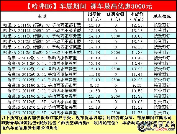 【廣西長道】4S旗艦店特推出車展長城汽車誠信新春‘惠’大型活動,現(xiàn)特推出哈弗H6裸車*高優(yōu)惠3000元優(yōu)惠活動!疽陨纤袃(yōu)惠內(nèi)容僅限預(yù)訂客戶享受,現(xiàn)車優(yōu)惠內(nèi)容以到店咨詢?yōu)闇?zhǔn)】;顒悠陂g,廣大車友可對自己喜歡的車型進行親密接觸并體驗試駕,購車更可享受裸車真正優(yōu)惠。為了回饋廣大車主對廣東有道汽車集團十年來的信賴,有道集團旗下所有門店同賀。購車客戶更有機會獲得兩次空調(diào)清洗加一次四輪定位的超值服務(wù)禮包。12月5日至12月31日舉行賀店慶售后服務(wù)節(jié)活動。進店維修或保養(yǎng)客戶即享空調(diào)清洗5折,續(xù)保折上折,更有機會贏取HTC高端智能手機大獎,感興趣的朋友可以到店咨詢購買或致電咨詢!緩V西長道:0771-2330301 (安吉4S店)0771-6735498(白沙4S店)0771-3922501(安吉直營店) 】