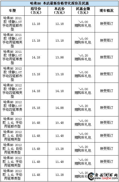 長(zhǎng)城汽車【廣西長(zhǎng)道4S店】為了感謝廣大車友一直以來(lái)對(duì)我公司、對(duì)長(zhǎng)城汽車品牌的厚愛(ài),我公司特開(kāi)展本次集合試駕、特惠、團(tuán)購(gòu)為一體的大型送福季活動(dòng),F(xiàn)特推出哈弗H6*高綜合現(xiàn)金優(yōu)惠2000元,送超值禮包【以上所有優(yōu)惠內(nèi)容僅限預(yù)訂客戶享受,現(xiàn)車優(yōu)惠內(nèi)容以到店咨詢?yōu)闇?zhǔn)】;顒(dòng)期間,廣西長(zhǎng)道特進(jìn)行全系車型試駕特惠周活動(dòng),店慶豪華禮包車型特惠,鉅惠享不停。為進(jìn)店維修保養(yǎng)客戶舉行賀店慶售后服務(wù)節(jié)活動(dòng)。進(jìn)店維修或保養(yǎng)客戶即享空調(diào)清洗5折,續(xù)保折上折,更有機(jī)會(huì)贏取HTC高端智能手機(jī)大獎(jiǎng)。除了驚喜大獎(jiǎng),廣西長(zhǎng)道提供最快15分鐘的雙人快保服務(wù),省時(shí)高效用心服務(wù)。