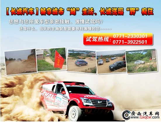 長城汽車2013達喀爾拉力賽依舊表現強勁,追平歷史**水平,達喀爾這個魔鬼賽場充分見證了長城汽車的越野品質!為祝賀長城汽車在達喀爾賽場上的優(yōu)異表現,廣西長道旗下白沙4S旗艦店、安吉4S店、安吉直營展廳統一舉辦-暢享城市“越”生活、長城送福“野”瘋狂-向達喀爾致敬“野外專場試駕會”,野外激情試駕活動,網友報名獨享優(yōu)惠,活動車型均可激情試駕拿好禮,訂購車型更可豪禮盛惠,只需您報名參加活動,即可跟您所愛車型親密接觸、激情試駕,底價盛惠讓您更快更省實現有車夢,還等什么,就是需要尋找激情的您~
