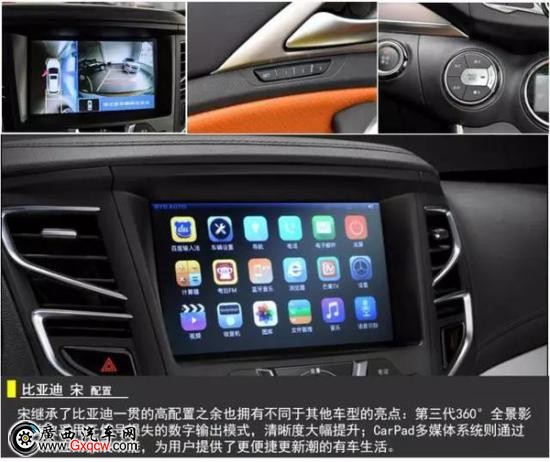 高配置是我們對(duì)比亞迪產(chǎn)品一貫的印象,宋也毫無例外地繼承了這一優(yōu)勢(shì)。如PM2.5綠凈系統(tǒng)、行車記錄儀、記憶聯(lián)動(dòng)系統(tǒng)等高大上配置一應(yīng)俱全。值得稱道的是,當(dāng)很多車聯(lián)網(wǎng)車型還停留在測(cè)試階段時(shí),比亞迪宋已經(jīng)正式上市,其搭載的CarPad多媒體系統(tǒng)通過強(qiáng)大的應(yīng)用拓展功能,為用戶提供了更便捷更新潮的有車生活。