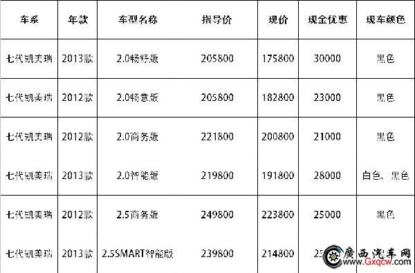 2013年7月1日-7月31日,廣汽豐田大輿邕賓店凱美瑞*高優(yōu)惠3萬元,感興趣的朋友可以到店咨詢購買,具體優(yōu)惠信息請(qǐng)見下表: