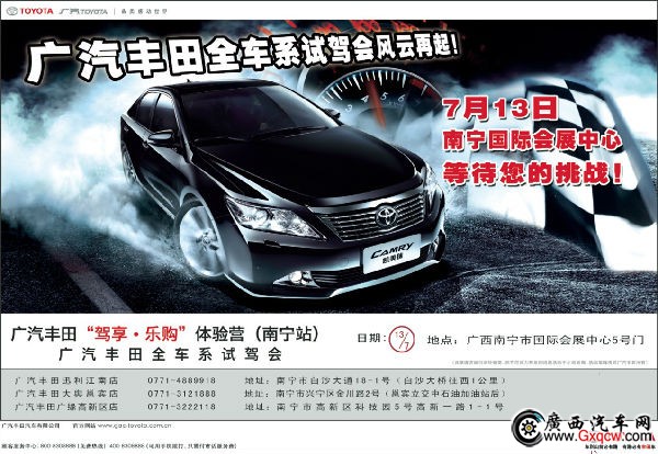 廣汽豐田“駕享?樂購”全車系試駕會將于7月13日在南寧國際會展中心5號門舉行,屆時,多家主流汽車媒體與眾多新凱美瑞、漢蘭達、逸致和雅力士的意向客戶都親身參與,零距離感受廣汽豐田全車系產品的優(yōu)越操控性能和卓絕科技品質,深度領略廣汽豐田全車系產品所帶來的巔峰科技魅力。