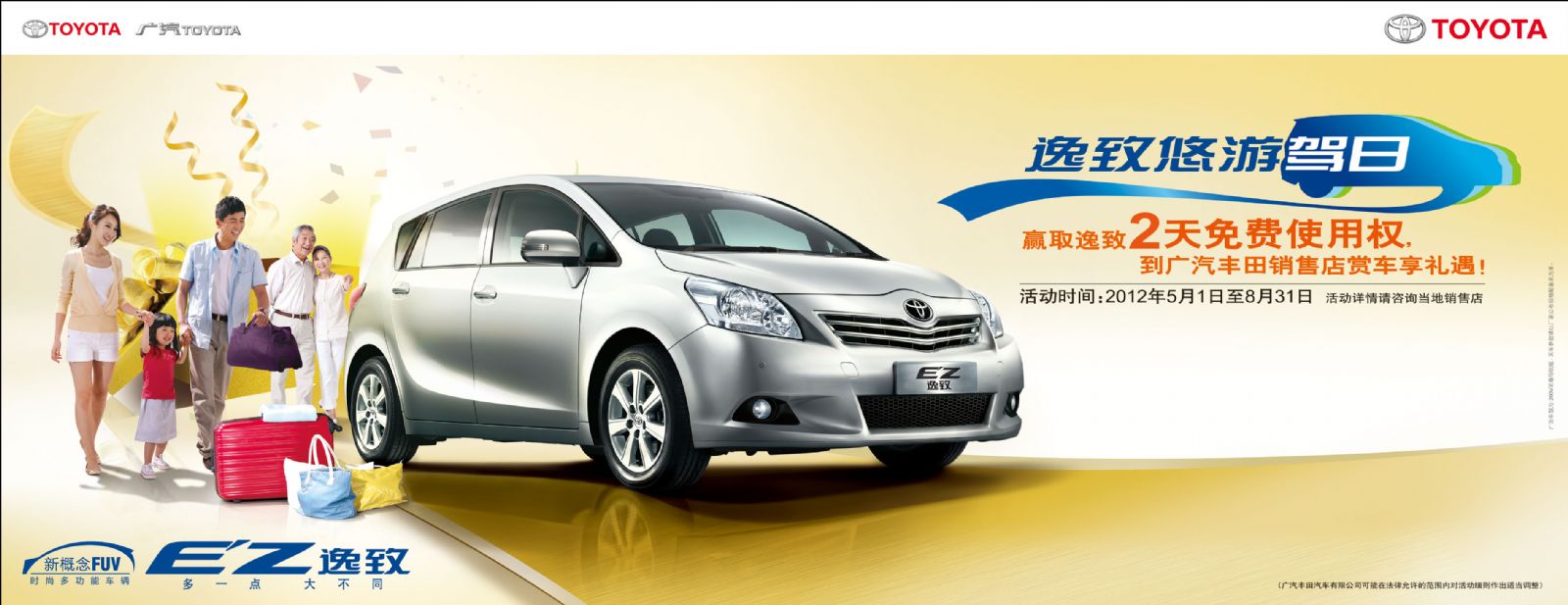 根據(jù)活動主辦方介紹,“逸致悠游駕日”活動在“北京、上海、廣州、杭州、南京”等全國31個城市同步啟動,將持續(xù)四個月,到8月底結(jié)束。本次活動主要面向已經(jīng)取得駕照、并且有一年以上實際駕齡的消費者。參與方式非常簡單:消費者只要在活動期間,到廣汽豐田4S店試駕逸致,就有機會獲贈價值978元的代金券,憑此代金券消費者到指定的神州租車網(wǎng)點,辦理簡單的手續(xù)后,就可以將逸致提回家,免費使用2天。