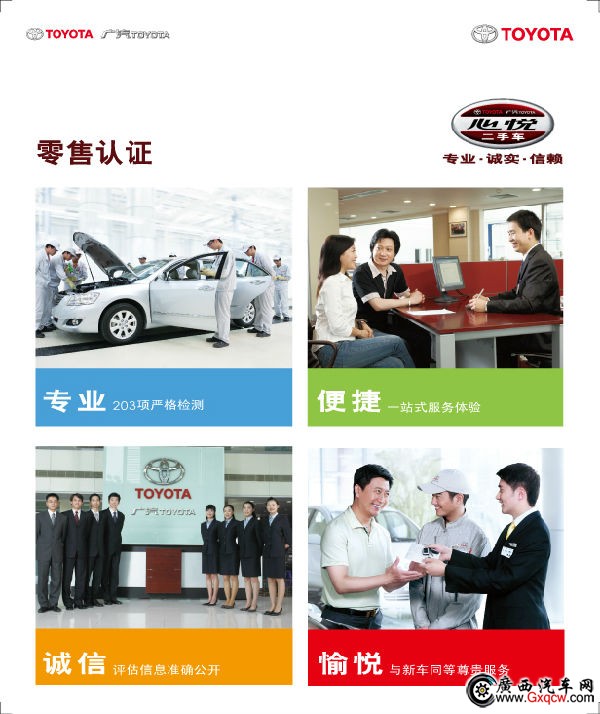 廣汽豐田“心悅二手車”結(jié)合國內(nèi)情況,制定出高達203項的二手車檢測標準,遠遠高于《規(guī)范》的規(guī)定范圍,是目前業(yè)界最嚴格最完備的檢測標準之一。在二手車領(lǐng)域,以顧客需求為導(dǎo)向的廣汽豐田一直都走在行業(yè)之先,建立起以“專業(yè)、誠實、信賴”為三大核心價值的“心悅二手車”品牌。其中二手車專業(yè)評估鑒定業(yè)務(wù)更是以其專業(yè)、誠信的服務(wù),樹立起行業(yè)的標桿,引領(lǐng)二手車評估鑒定服務(wù)向規(guī)范化的方向發(fā)展,也因此贏得了顧客的信賴,獲得業(yè)界和顧客的一致認可。