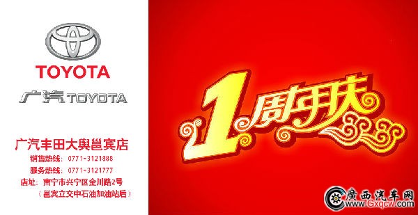 一年來感謝有您的陪伴,1月12日廣汽豐田大輿邕賓店一周年慶暨新春感恩回饋活動(dòng)期待您的加入,活動(dòng)咨詢熱線:0771-3121888,店址:南寧市興寧區(qū)金川路2號(hào)(邕賓立交中國(guó)石油加油站后)