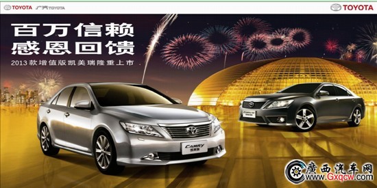 百萬(wàn)信賴 感恩回饋――凱美瑞2013款增值版隆重上市,廣汽豐田大輿邕賓店將于3月16日在店舉辦上市活動(dòng),活動(dòng)當(dāng)天將有驚喜禮品,訂車(chē)還可參與心動(dòng)抽獎(jiǎng)活動(dòng),有機(jī)會(huì)獲得價(jià)值1000元的精品代金券,歡迎各位車(chē)友來(lái)店。