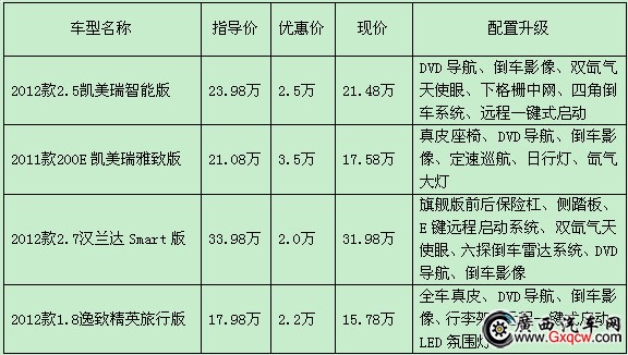 廣汽豐田大輿邕賓店展位和展廳同時(shí)享受車(chē)展特惠價(jià),凱美瑞、漢蘭達(dá)、逸致、雅力士四款車(chē)型萬(wàn)元鉅惠,歡迎廣大車(chē)友到I8廣汽豐田大輿邕賓店展位賞車(chē)訂車(chē)。詢(xún):0771.3121888。