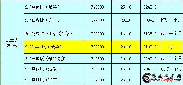 2013年04月19日-2013年04月27日,廣汽豐田大輿邕賓店漢蘭達(dá)*高優(yōu)惠2.5萬元,感興趣的朋友可以到店咨詢購買,具體優(yōu)惠信息請見下表: