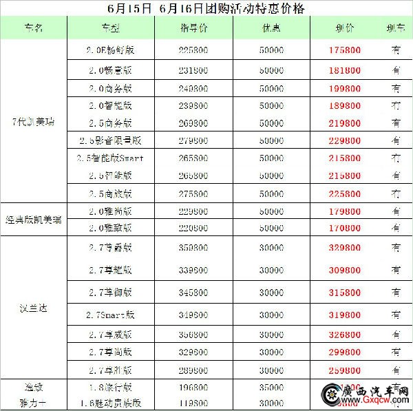為答謝廣汽豐田客戶(hù)的關(guān)懷與支持,廣汽豐田大輿邕賓店特別在6月15-16日推出了團(tuán)購(gòu)嘉年華--年中促銷(xiāo)活動(dòng),更有渠道周年紀(jì)念版車(chē)型限量出售,凱美瑞2.0智能版、2.0雅尚版鉅惠50000元,漢蘭達(dá)2.7尊爵版鉅惠30000元,讓您享惠樂(lè)不停!