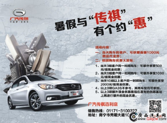 暑假期間,帶您的家人和朋友到廣汽傳祺迅利店,尊享專屬VIP服務吧,可以近距離接觸愛車,盡情體驗沒有彎道的傳祺世界,親,快快行動哦。。。!詳情請咨詢店內銷售顧問。