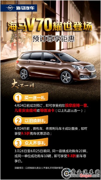 定位于自主中高端MPV的海馬V70預(yù)訂價(jià)區(qū)間為8.5萬(wàn)元-11.5萬(wàn)元,極具市場(chǎng)競(jìng)爭(zhēng)力。同時(shí)現(xiàn)在預(yù)訂更可享受“預(yù)訂尊享鉅惠三重大禮”!