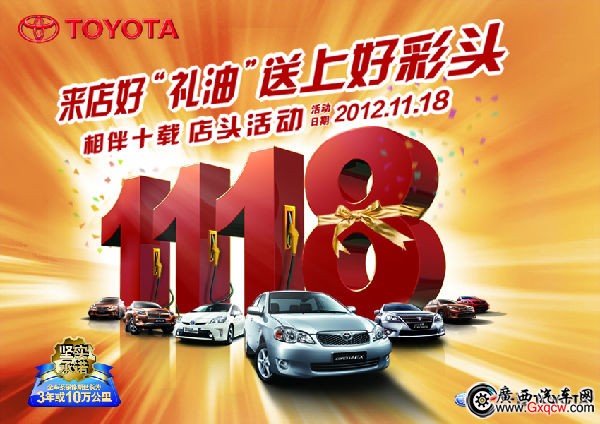 4重禮 11月18日來店購花冠,額外為你準(zhǔn)備1118升油,等你來贏,購車樂驚喜。訂車客戶還有三重禮上禮,①價值50元的電話充值卡一張;②1,000元購車禮一份(索尼全功能攝像機、飛利浦迷你音響底座、歐姆龍保健儀器五件套、歐西亞日間天氣預(yù)報時間投影顯示器);③有機會參與抽獎活動,贏取價值3,999元的暢游禮一份(香港?三亞二選一)。