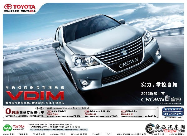 皇冠2012款具有四大突出實(shí)力優(yōu)勢(shì):VDIM車輛動(dòng)態(tài)綜合管理系統(tǒng),高兼容燃油經(jīng)濟(jì)性,絕佳靜謐的座艙空間以及獨(dú)有的GOA沖撞吸能式車身等安全配備。
