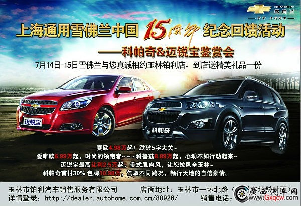 上海通用雪佛蘭中國15周年紀(jì)念回饋活動,車源不多,售完即止,歡迎廣大準(zhǔn)車主來店/電咨詢