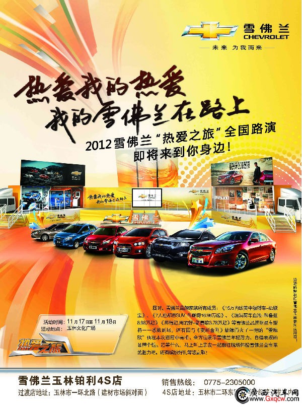 雪佛蘭全國路演大篷車走進玉林,路演活動將于11月17-18日在玉林市文化廣場舉行,屆時雪佛蘭鉑利店將會推出給力的購車優(yōu)惠政策,具體詳情請至玉林市一環(huán)背路建材市場斜對面雪佛蘭鉑利店了解,或致電2305000咨詢。