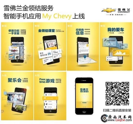 [導(dǎo)讀]雪佛蘭金領(lǐng)結(jié)服務(wù)智能手機(jī)應(yīng)用“MyChevy”上線。該軟件相當(dāng)于一位隨身的4S店服務(wù)顧問,隨時(shí)提供包括維修保養(yǎng)提醒、經(jīng)銷商信息查詢、金領(lǐng)結(jié)課堂養(yǎng)車貼士介紹、車主聚樂會(huì)活動(dòng)通知等各項(xiàng)服務(wù)。